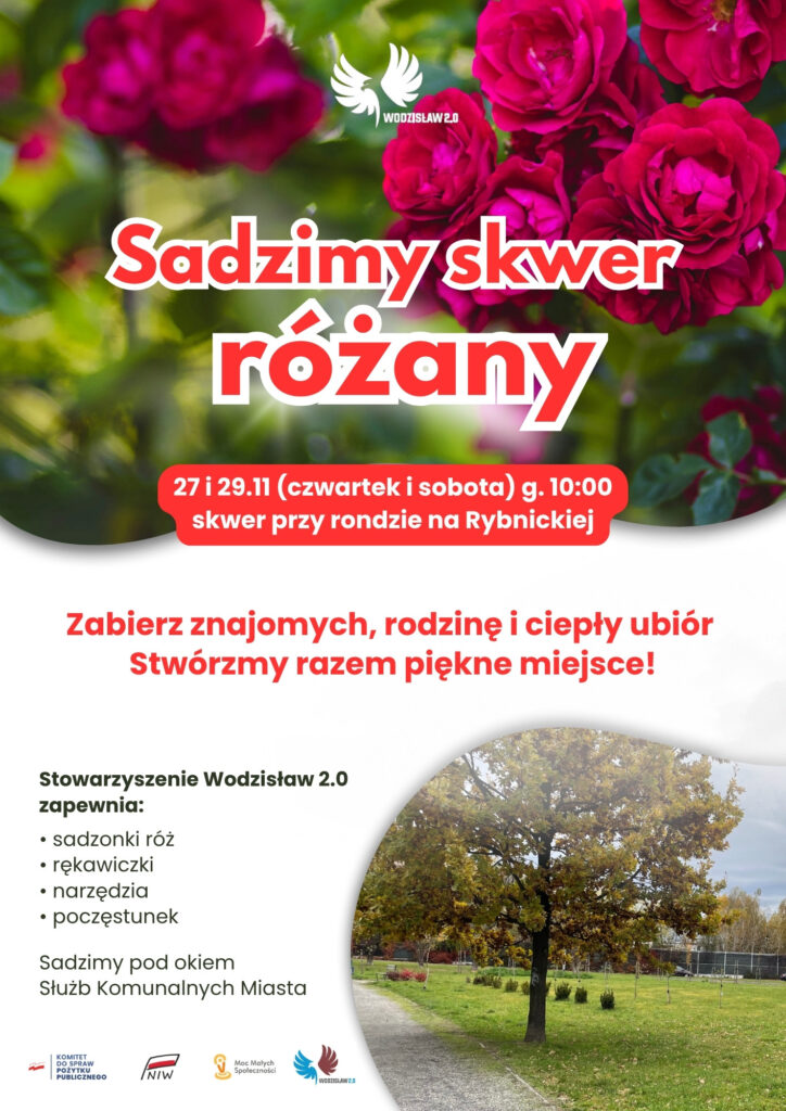 W ramach zadania #SpołecznaMOCWodzisławia, 27 (czwartek) i 29 listopada (sobota) o godzinie 10:00 będziemy sadzić róże na zielonym terenie przy ul. Rybnickiej/Armii Krajowej w Wodzisławiu Śląskim.